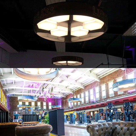 Hier haben wir die Innenbeleuchtung des LIMITLESS Fitnessstudios in Bergkamen übernommen. Diese besonders große, an das Studio angepasste Deckenleuchte, verleiht noch mehr Licht und Einzigartigkeit.