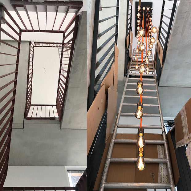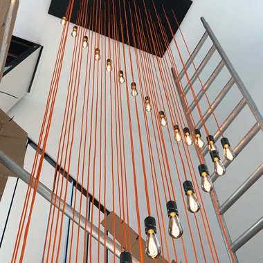 Dafür haben wir 30 MAGNUS Leuchten mit orangenem Industriekabel und einem Baldachin verbunden.